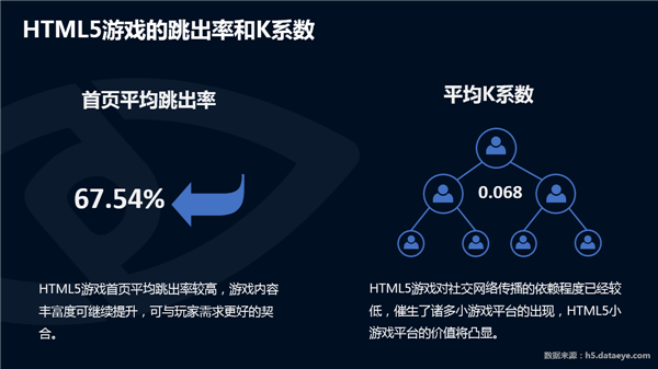 根据GoogleAnalytics的基准平均跳出率统计,内容网站跳出率大概在40-60%之间,而H5游戏首页平均跳出率为67.54%,明显高于平均数,因此内容方面还可以更丰富;而在传播性回归分析中k系数(0~1)只有0.068,反应出对网络传播依赖程度较低,由此催生了诸多H5游戏平台。
