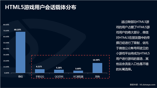 微信在H5游戏用户会话载体分布中依旧占据了主要地位,虽然目前微信已经对H5游戏在朋友圈的传播进行了限制,但相信依托于微信公众号所建立的小游戏平台将成为日后用户进行游戏首选。