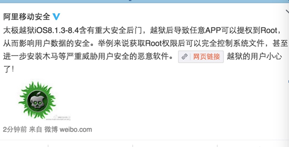 在昨日乌云曝光漏洞之后,网友对此也引发热议。毕竟网友在越狱方面的知识了解参差不齐,其中就有不少网友误认为所有越狱都存在这种后门,所以只要越狱就必须承担风险。对此专家回应,并不是所有的越狱都不安全,除太极团队以外的PP助手等越狱软件,验证不存在安全漏洞或者后门.