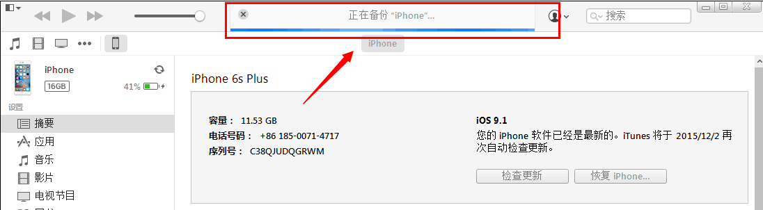 2、其次,itunes在对数据进行备份时,窗口顶端将会出现进度条显示当前是否已经备份,当进度条消失后,说明备份已经完成,备份比较消耗时间,通常几分钟到几小时不等。