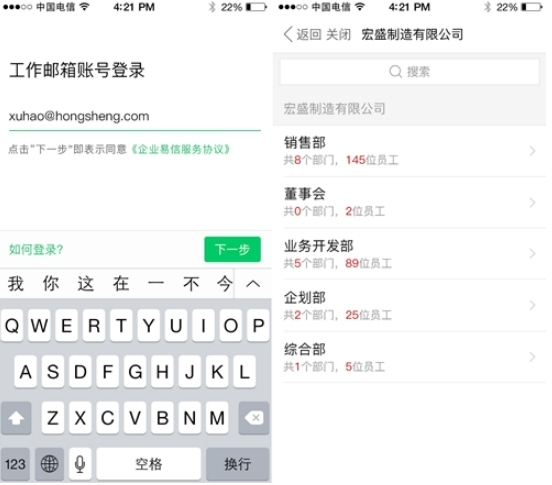 据悉,企业易信已与网易企业邮箱服务深度对接,国内数十万家使用网易企业邮的客户均可快速升级开通公司的“企业易信”,而企业内的通讯录架构无需重新导入,在“企业易信”中自动同步,方便查找组织架构中的不同联系人,并始终保持在同一个独立封闭的操作环境内。