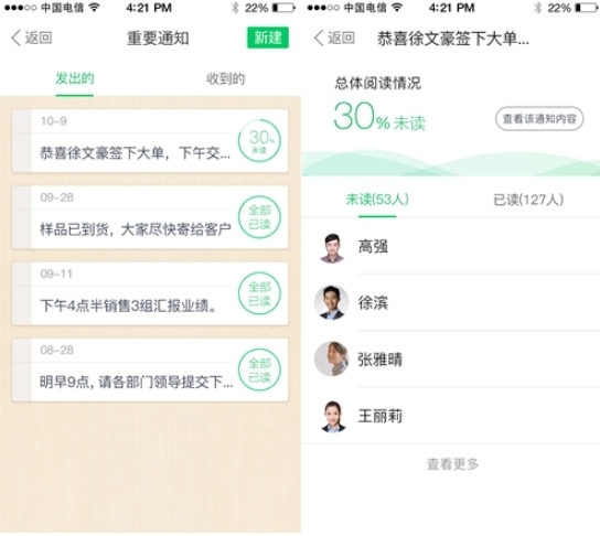 “办公沟通不等于闲聊天”。作为企业管理者往往纠结于移动通讯工具带来的便利和痛苦——便利性体现于随时随地可以和员工讨论及布置工作,而痛苦则在于由于消息密集繁杂而无法保证信息的准确到达和反馈。作为专注于企业内信息沟通和效率提升的移动办公应用,企业易信针对这一实际需求设计了颇为实用的“重要通知”功能。企业管理者或主管通过该功能,不仅可以发布企业内部的高优先级通知公告,并能追踪各部门、小组内的消息阅读情况,明确未读人员,后续还可进一步通过免费短信等方式二次提醒。