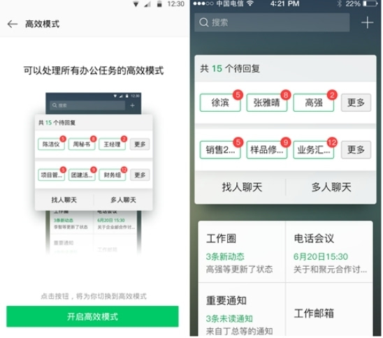 企业中总有一些重要岗位上的人员异常忙碌,针对每日信息量爆炸的这类用户,企业易信为其提供了量身定制的“高效模式”。据透露,这一功能是网易公司董事局主席兼首席执行官丁磊先生亲自提出原型需求和设计理念,可将所有待处理事项和沟通对象汇总到一个统一界面上,从而在最短时间内有计划、分缓急的处理待办事项,实现更合理的工作安排和更高效的工作部署。企业易信产品经理介绍此功能时补充,该功能并不仅仅是给公司老板使用,也适合公司内任何一个工作繁忙的“超级枢纽”,甚至可以通过这个界面充分体验一把“俯视全局翻牌子”的操控感。