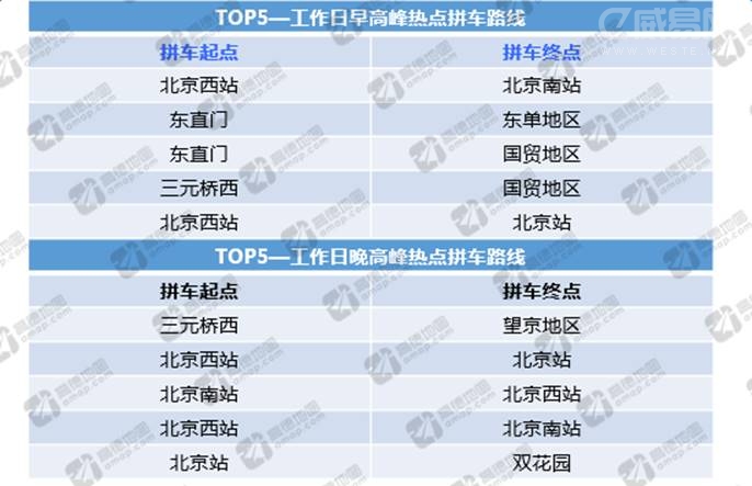 本次报告,高德地图联合清华大学戴姆勒可持续交通研究中心针对拼车(包括顺风车)市场进行了研究。研究团队选取了北京五环内出租车的出行数据(南北向各约30km,共计约809万次出行,着重考虑起点和终点都在此区域的打车情况),发现工作日不同时段的出行需求重合度很高,拼车潜力巨大。