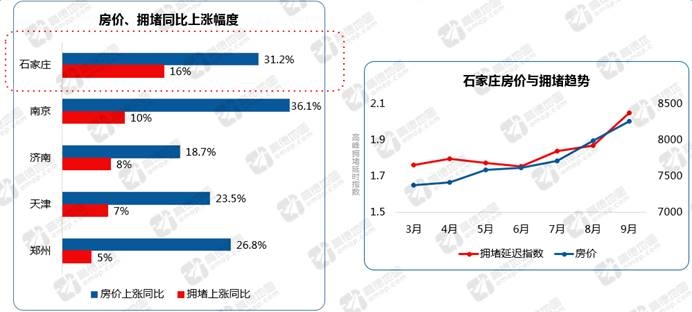 根据本季城市拥堵与房价涨幅程度分析发现,双双上涨最大的城市分别为:石家庄、南京、济南、天津、郑州。其中涨幅领涨全国的城市是石家庄,拥堵同比去年上升16%,房价增幅31.2%,这可能与京津冀一体化的发展有关。