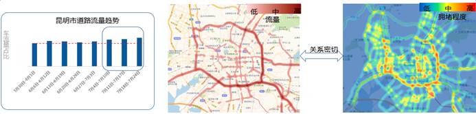 昆明7月份车流量上升明显,城市总体流量约增长19%,这与云南区域自驾游火热有一定的关系。而昆明二环路里程占比不足0.3%的道路承载了城市26%以上的出行需求,流量分布的不均衡,也造成了城市的拥堵。