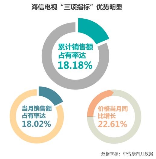 乱世出英雄。截止4月,龙头老大海信累计销售额占有率达到18.18%,当月销售额占有率达到18.02%,价格当月同比增长22.61%,三项指标较去年均有幅度较大的提高。而其他品牌同比下降明显。分析得知:大屏幕“救了”海信。海信在55吋以上大屏幕电视销售额已占海信整体的64.30%,销量也已占整体的45.66%。海信主推的激光电视整个市场月度环比增长达到422.92%,继续保持高位增长。行内人士推测:海信提前锁定了“世界杯”独家营销资源,再加上国际足联委托其开发显示技术做实力背书,销售端的“排他”在4月开始得到呈现。