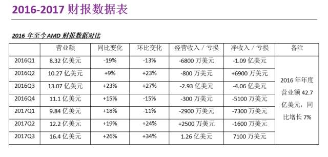 图为AMD公司2016-2017每季度财报数据对比(截至2017年第三季度)