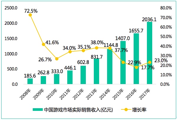 整体来说,2017年中国游戏市场实际销售收入达到2036.1亿元,同比增长23.0%。