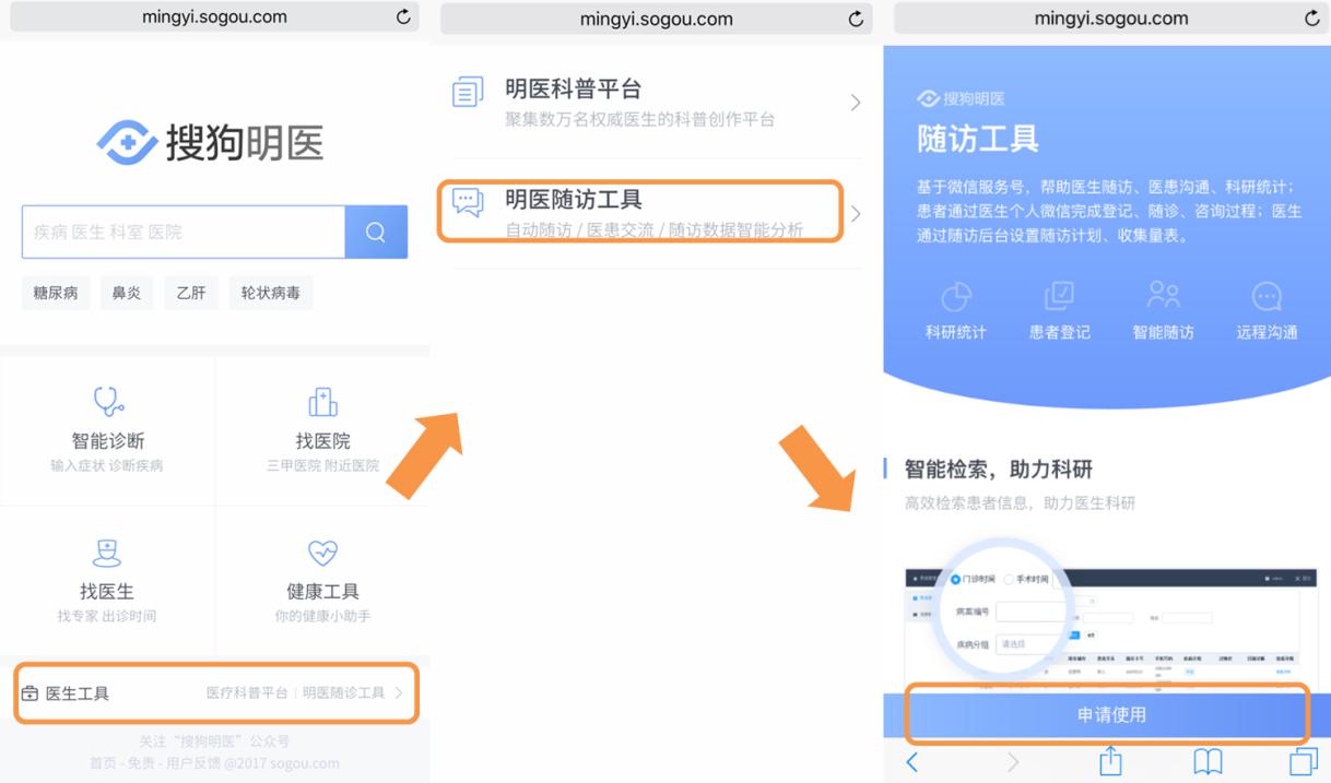 据了解,“医生随访工具”在北京协和医院基本外科郭俊超教授团队的微信公众号“胰路同行”上线后,在3周内积累并服务了百余名患者,随访及科研效率显著提升。对于希望体验“医生随访工具”的医院、科室或医生,只需在搜狗搜索的“搜狗明医”频道中,点击下方的“医生工具”,并找到“医生随访工具”进行申请,即可使用。