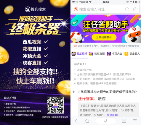 然而,集万千宠爱于一身的汪仔答题助手并没有就此止步不前。在1月14日,搜狗再次对汪仔答题助手进行重大升级,已经能够支持包括西瓜视频“百万英雄”、映客的“芝士达人”、花椒直播“百万赢家”、“冲顶大会”等四大答题平台,让网友无论跳转到哪个答题平台,都可以用汪仔答题助手轻松答题赢奖金。