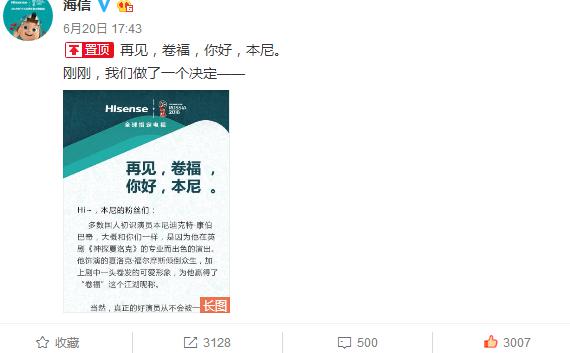 海信官方微博中写道,代言人消息发布后,尤其是世界杯开赛以来,海信感受到了本尼粉丝对“卷福”这个称呼的纠结——“卷福”只是本尼饰演多个角色中的一个,但这个标签如影随形至今,几乎让人忘记了他的名字本尼迪克特·康伯巴奇,这对一个顶级的实力派演员来说,的确是有些尴尬。