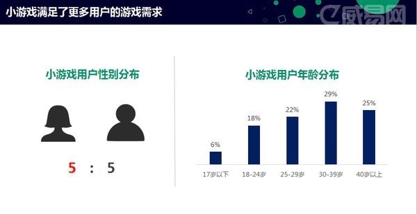 另外,小游戏性别分布比例较为均衡,男女比例五五开。同时在年龄分布上也呈现出集中于25岁以上用户的趋势。同时,官⽅鼓励开发者研发更多轻操作、社交性强、体验乐趣高、⼥性向的小游戏。