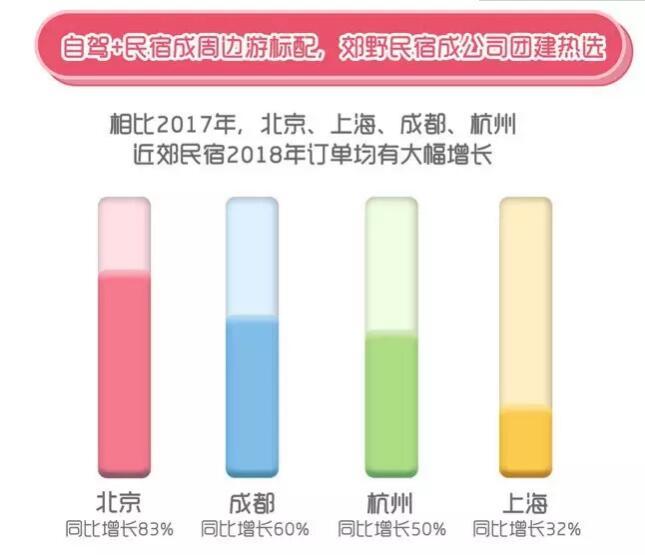 在消费升级的背景下,都市周边自驾游也持续火热,呈现出消费高频化、随订随出发的特点,据公安部数据显示,全国汽车保有量超过2.17亿辆,北京、成都、重庆、上海等7城市私家车保有量超300万辆,自驾游的火热也持续推动了近郊民宿的蓬勃发展。小猪短租数据显示,相比2017年,北京、上海、成都、杭州近郊民宿2018年订单均有大幅增长,其中,北京近郊民宿订单同比增长83%,成都同比增长60%,杭州50%,上海增幅达32%。越来越多的自驾游客更愿意选择在近郊民宿过夜,自驾+民宿的生活方式备受城市居民的青睐。