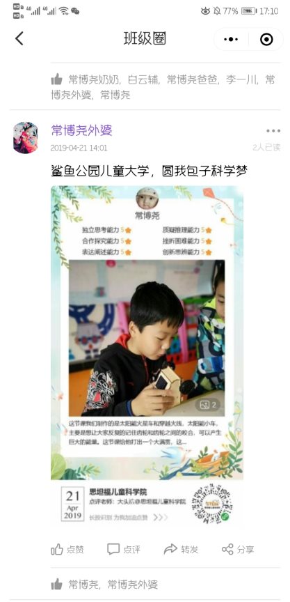 鲸相册的特色功能——班级圈提供了一个模拟的线上班级,为学员营造了在校园的氛围,增加了学员的归属感。每一次上课后,思坦福儿童科学院的老师会在班级圈发表课程总结、学员家长可以发现课程学习感想,深入了老师和家长的互动和沟通,这不仅是老师的记录,也是学员成长的记录,而每一次记录不仅是思坦福儿童科学院教学和服务的记录,更是思坦福儿童科学院教学服务最好的效果外化。