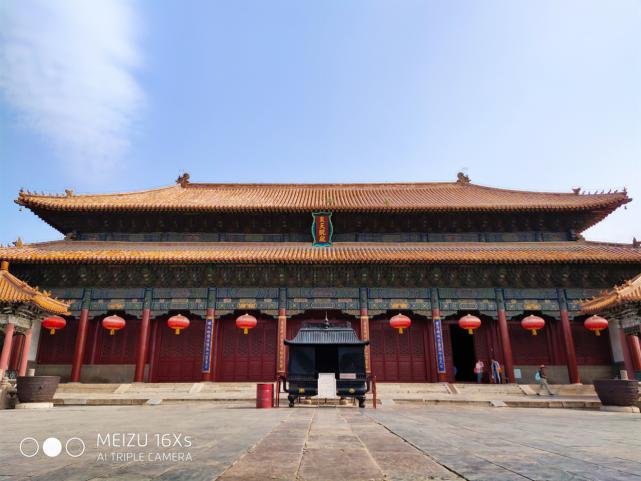 雄伟的天贶殿,三面雕栏围护,殿面阔九间,重檐八角,斗拱飞翘,上覆黄琉璃瓦。在118°广角镜头下尽收眼底,魅族 16Xs 在拍照时的表现可圈可点。