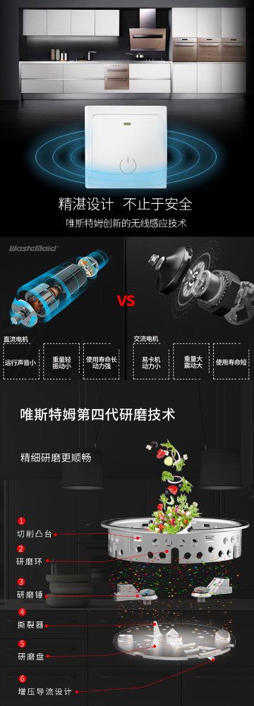 线上新品,无线感应开关、自动关机功能(智能监测垃圾残留)快速安装系统方便快捷、增强静音技术、五级研磨系统、直流电机(F级纯铜漆包线绕组)、高扭矩、高转速、409不锈钢研磨盘、304不锈钢研磨锤强力研磨。