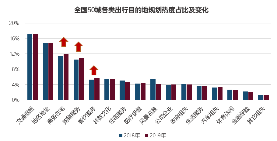 值得一提的是,得益于国民可支配收入的持续增长,国人出行需求更加多元化。据高德地图2019年度驾车出行热度数据显示,交通枢纽的出行需求依然排名第一,占比达17.2%;商务住宅、购物、餐饮类目的地的出行热度同比也有所上升,其中购物、餐饮相关目的地的出行需求合计占比达16.61%,同比提升4.8%。