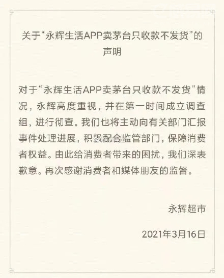 针对“永辉生活APP卖茅台只收款不发货”的情况,永辉超市发布声明回应称,永辉高度重视,并在第一时间成立调查组,进行彻查。