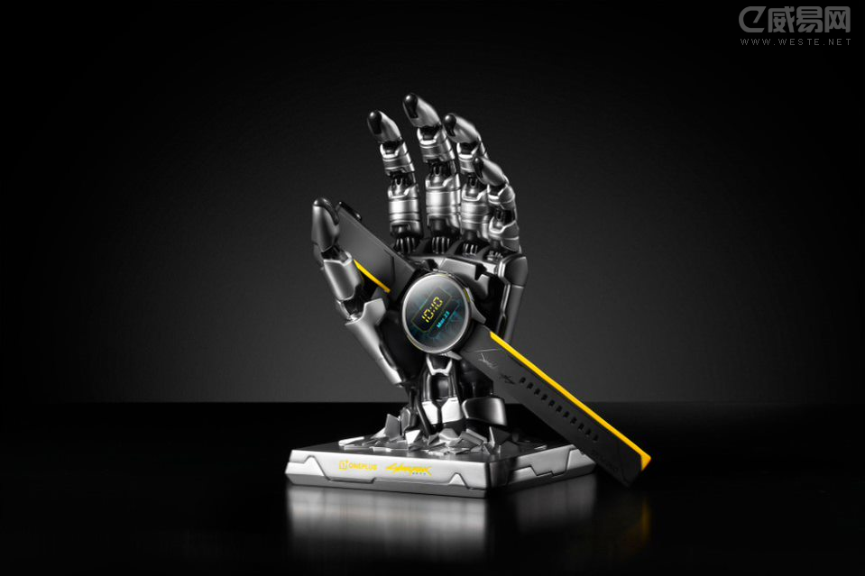 最让游戏玩家惊喜的还是 OnePlus Watch 赛博朋克 2077 限定版重磅定制了别具一格的手办——一加银手充电表托。表托以游戏核心人物强尼·银手的标志银手为原型,设计成为充电表托,既能为手表充电,也能日常放置手表,兼具实用和外观两大特性,游戏情怀拉满。值得一提的是,一加银手充电表托随手表附赠。