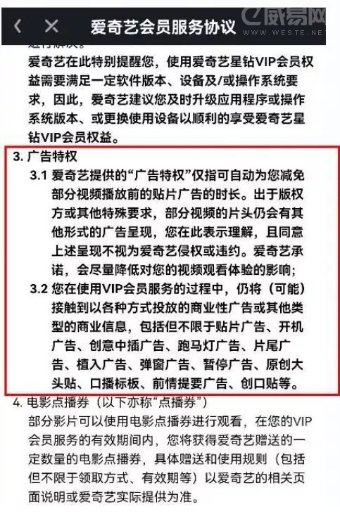 比如有的就几乎列出了多达12种将有的广告形式:在使用VIP会员服务的过程中,仍将(可能)接触到以各种方式投放的商业性广告。包括但不限于贴片广告、开机广告、创意中插广告、跑马灯广告、片尾广告、植入广告、弹窗广告、暂停广告、原创大头贴、口播标板、前情提要广告、创可贴广告等。