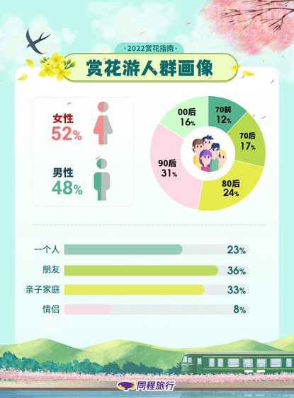 同程旅行大数据显示,赏花游对男性和女性游客同样具有吸引力。在关注赏花游的人群中,男性占比48%,女性占比52%,几乎持平。在年龄分布上,80后和90后更爱赏花游,00后赏花游客群体增长迅速,占比从去年的5%提升至今年的16%。和朋友一起相约赏花的游客,在赏花人群中占比最高,达到36%,带着家人孩子一起外出赏花的游客占比也达到33%。