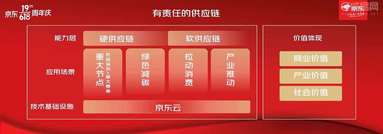 即基于京东多年来在硬供应链和软供应链能力上的打磨和经验积累,充分发挥京东数智化社会供应链在重大节点、绿色减碳、拉动消费、产业推动四大场景中的作用,在实现商业价值、产业价值的同时,践行更多社会责任,实现更大的社会价值。