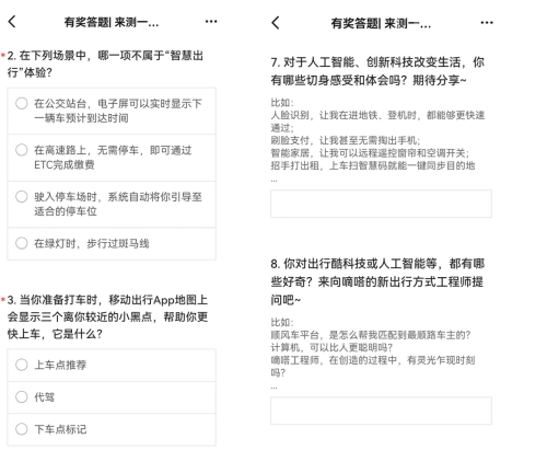 此次,嘀嗒出行还发起了主题为“测一测你的出行酷科技达人指数”的首届“有奖答题挑战赛”。该比赛旨在通过重要科技概念科普、智能科技应用场景和原理、用户对智能科技的切身体会和好奇等多个维度,助力广大用户加深对智慧出行的具体感知,唤起更多科学探索乐趣和兴趣。