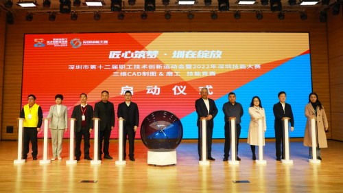 10位领导嘉宾一起按下倒数按钮,深圳市第十二届职工技术创新运动会暨2022年深圳技能大赛——三维CAD制图技能竞赛以及磨工技能竞赛正式启动!