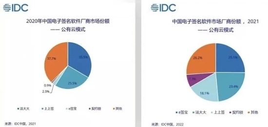 通过IDC《2021年中国电子签名解决方案市场份额报告》、《2020年中国电子签名软件市场份额》两份报告,不难测算出:
