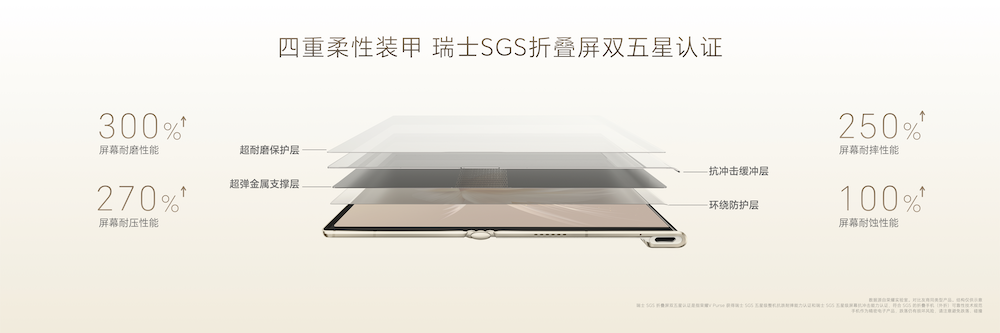 实现里程碑式轻薄的同时,荣耀V Purse并未降低对产品坚固性和耐用性的要求,带来了由保护层、缓冲层、支撑层和防护层共同构成的“四重柔性装甲”解决方案,相较于已经面市的外折形态折叠屏,防刮性能最高提升300%,确保日常使用的强耐磨度,获得瑞士 SGS 五星级整机抗跌耐摔能力认证和瑞士SGS五星级屏幕抗冲击能力认证。