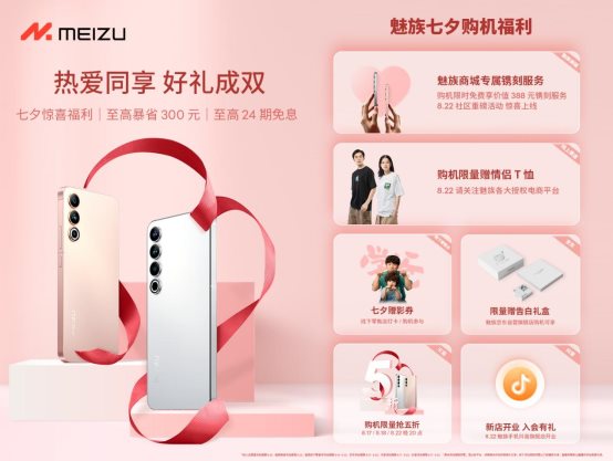 魅族在8月22日当天推出天猫旗舰店整点购机享受5折优惠的活动。同时在魅族京东自营旗舰店购买魅族20系列手机,还可获得限量告白礼盒,让甜蜜满满的爱意铺陈于心。除省钱优惠购,魅族商城还上线了七夕免费镌刻活动。购买魅族20或魅族20 PRO系列手机的用户,均可免费获赠价值388的专属镌刻服务。该服务包括图片、文字及图文形式三种选择,用户可根据自身偏好自选形式,将深情告别镌刻在手机上。