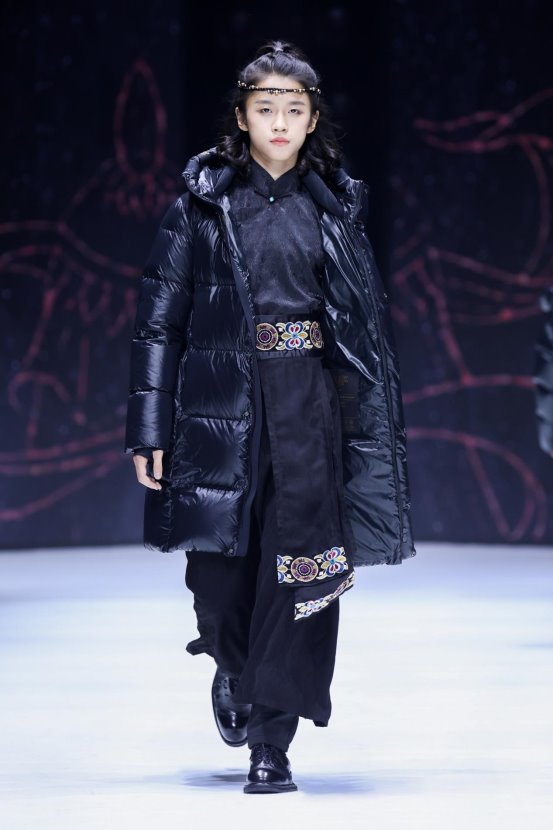 巴图、博谷则身穿“藏地黑金”将高梵与92岁唐卡大师嘎玛德勒联名款展示给观众。“藏地黑金系列”选用了唐卡中的两个图腾,如意宝和智慧之剑。门襟处设计如意宝,代表着力量和智慧,象征着平安吉祥,如意宝上面的宝珠,传说能治百病,同时有健康的寓意。这是大师在知晓图案是给小孩穿的,就选出了最有代表性的图腾,而在帽子上将高梵的LOGO和唐卡中的智慧之剑进行结合。