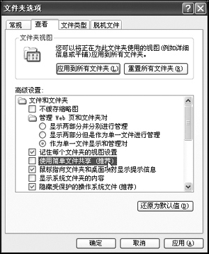 依次打开“开始→控制面板→外观和主题→文件夹选项”,在“文件夹选项”对话框中单击“查看”选项卡,在“高级设置”下面,将“使用简单文件夹共享(推荐)”前的复选框清空(如图),然后单击“确定”按钮退出。