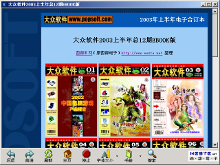 西部E网再次隆重推出《大众软件》2003年下半年电子合订本,集《大众软件》杂志精华、西部E网的 EBOOK 制作经验制作的“一本”精华合订本!欢迎各位朋友下载!如转载请保留西部E网的信息。上下两册包括《大众软件》2003年总24期,西部E网只是做了一点点下载和打包的工作,在此感谢《大众软件》杂志为我们提供这么好的杂志!