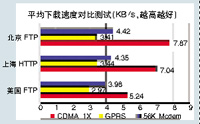 从速度表现来看,CDMA 1X是最为出色的,尽管距离理论上的峰值仍有不小的距离,但是已经超越了56K外置Modem,速度完全能够让人接受。相对而言,GPRS表现欠缺一些,或许是因为中国移动的网络负荷量过大,其速度下降十分明显,甚至不如56K Modem。