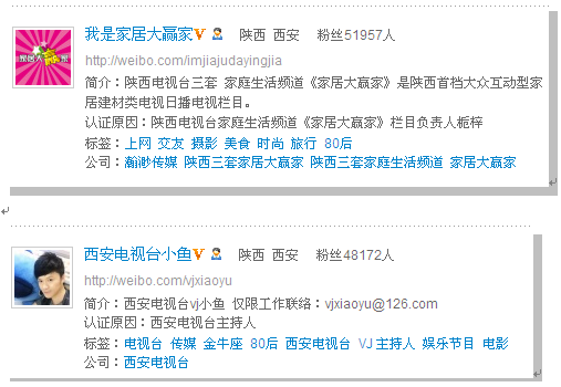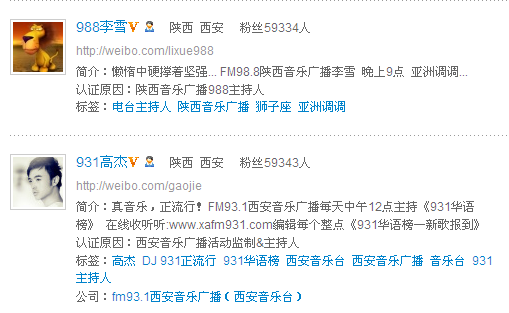 A:电台DJ,陕西广播电视台的各位节目主持人都在新浪微博中开通了微博和大家在节目中进行互动,每天的广播中都会听到他们在电波中进行各类的宣传,让听众通过各种方式登录微博进行互动。