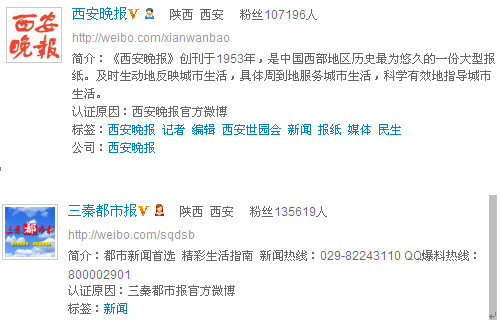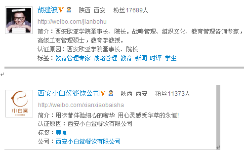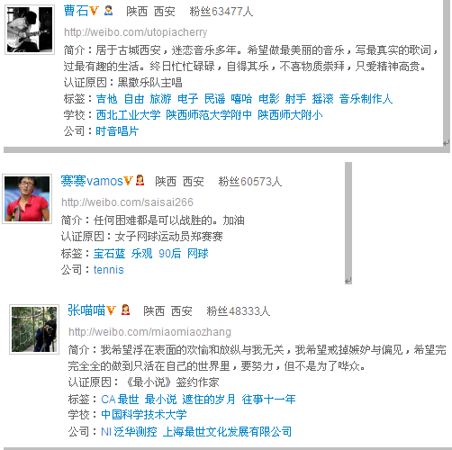西安新浪微博用户大多数集中在以下几类用户之中: