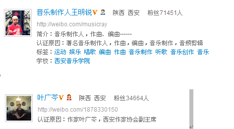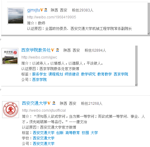 以上微博均是加V微博,用官方语言来说就是经过微博认证的,这些基本上都是真人真事真机构的微博,或作为机构,或作为个人来发表一些信息和见解。