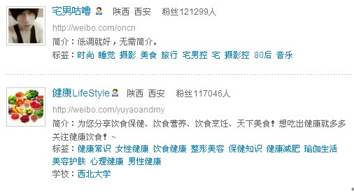 笔者在搜索的过程中发现,西安微博界也有百万级粉丝的微博,就是以下两位,他们的微博每日更新量在50条左右,发布的都是时尚潮流大家感兴趣的信息,每个微博的转发率都是3000条往上,评论数都在1000条左右。