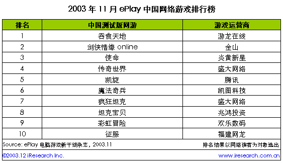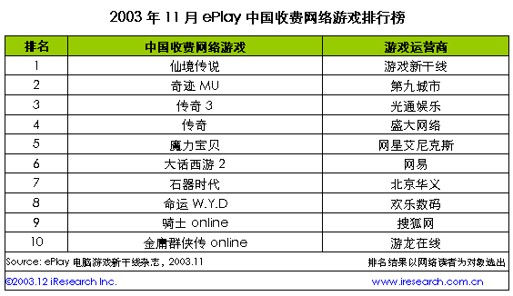 收费游戏排名的前十款游戏全是MMORPG(大型角色扮演类游戏)。代理运营的韩国游戏占了6款并包揽了前4名。