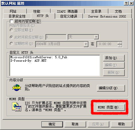 首先,打开IIS为其设置新的MIME类型,在网站属性的HTTP头选项中设置。(如图:)