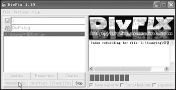 DivFix的操作非常简单,首先点击“Add files”,打开受损的AVI文件,然后直接点击“Rebuild Index”按钮,这样DivFix即会为此文件建立一个索引,这样您就可以在播放时快进、倒退或用鼠标直接拖动时间条了,界面右边的窗口则显示程序的运行状态。
