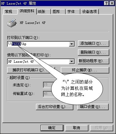 当网络打印机从局域网中的一台电脑换接到了另一台电脑后,只需要更打印机端口即可,方法是(以HP LaserJet 4P打印机为例):
