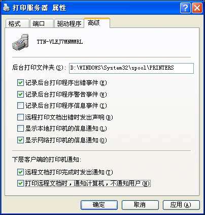 3. 选中“远程文档打印完成时发出通知”复选框,则在文档打印时打印子系统会发送一个通知消息。如果清除“打印远程文档时,通知计算机,不通知用户”复选框,那么该消息会通知用户;如果选中该框,则系统将通知打印文档的计算机,此时你登录到哪台计算机就无关紧要了,该消息将会出现在打印文档的计算机上。