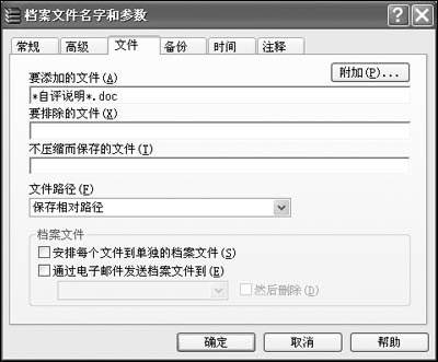 如图所示,可以看到这里有“要添加的文件”和“要排除的文件”两项设置,由于这里我们只需要将文件名中包含“自评说明”字符的文件添加进来,因此可以在“要添加的文件”栏中键入“*自评说明*.doc”,其余的设置不用更改。