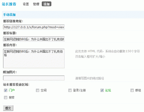 如果网站管理者想为社区就某一事件制造一个讨论高潮,或者联合商家举办一次抢楼、团购等活动推荐,那么“站长推荐”功能就可以派上用途。