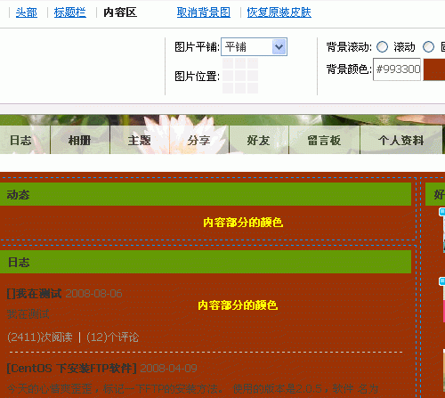 其中,自定义装扮空间功能,可以方便家园的会员上传自己喜欢的背景图片,包括头部、标题、内容区域如何显示,显示那些内容,如何布局全部由用户决定,操作简单方便,能DIY出用户最满意的个人空间风格。下面具体介绍: