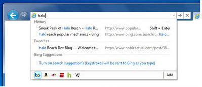 IE9和微软必应搜索引擎的结合也更为紧密。IE9的将地址栏和搜索栏整合为一个输入框,用户键入单词,IE9就会按照访问历史、收藏夹相关和必应搜索推荐展示下拉菜单,这三种相关推荐几乎让用户无需进一步搜索和键入,可以迅速找到需要的网站。用户也可以在这三种推荐之外添加其他选项,让自己 熟悉的服务融入整个浏览进程。