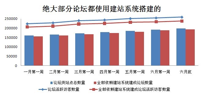 特别的,论坛类网站是建站程序使用率最高的网站类型,事实上,多数个人站长的第一个网站都是使用建站程序搭建的论坛。截至2010年6月底,在19.8 万个论坛类网站中使用建站程序搭建的网站比例达到97.7%,比年初的97.2%略有增长。其中使用建站程序搭建的论坛的访客数为1.01亿,占论坛类网 站总访客的95.2%.其中活跃访客数为1173万,占总活跃访客的93.7%。